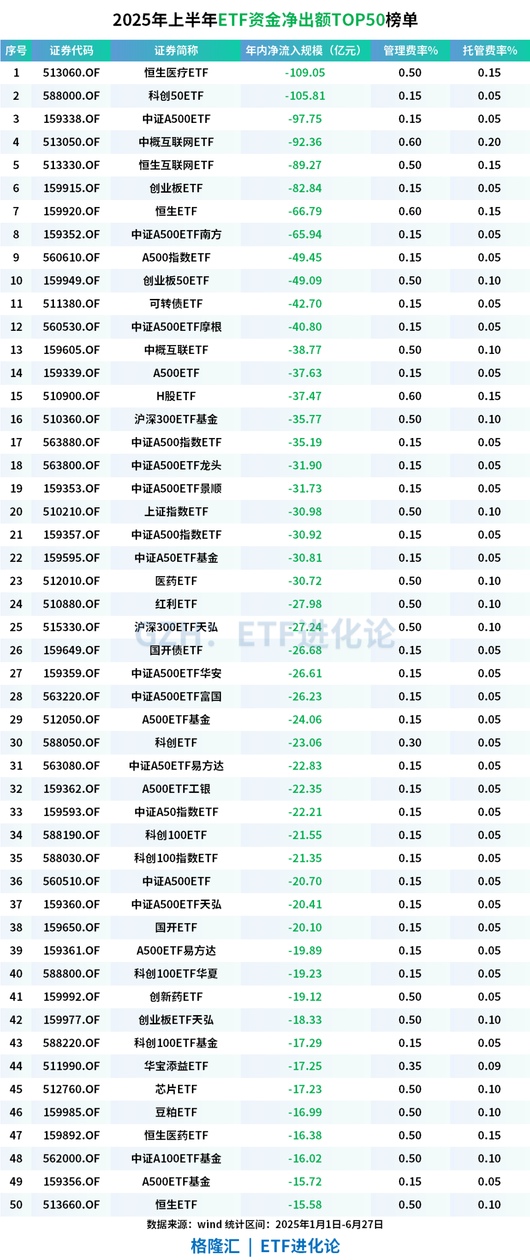 年内超百亿资金净流出恒生医疗ETF、科创50ETF;此外,中证A500指数成为资金上半年主要流出方向。