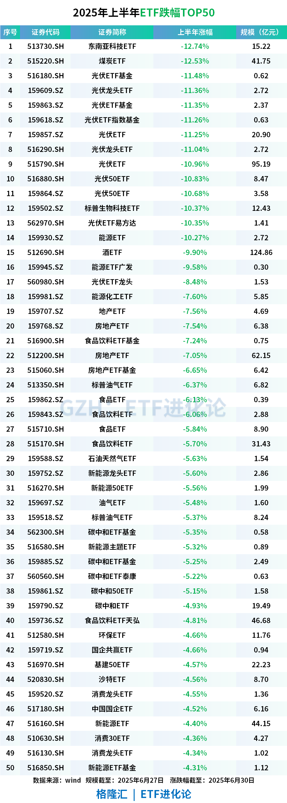 光伏、能源板块主题ETF上半年领跌,东南亚科技ETF、煤炭ETF、光伏ETF、标普生物科技ETF、能源ETF跌超10%。
