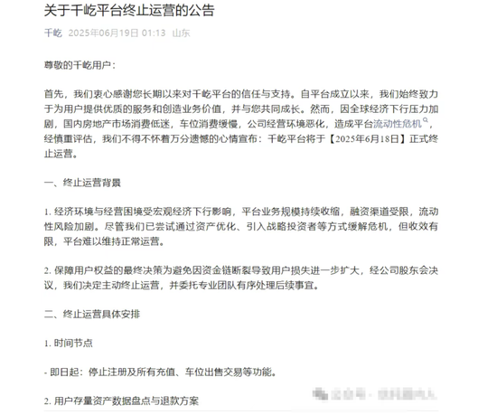 就在刘某党逃到日本后,6月18日,“千屹”官方微信公众号发布《关于千屹平台终止运营的公告》,公告称:因全球经济下行压力加剧,国内房地产市场消费低迷,车位消费缓慢,公司经营环境恶化,造成平台流动性危机,经慎重评估我们不得不怀着万分遗憾的心情宣布:千屹平台将于2025年6月18日正式终止运营。